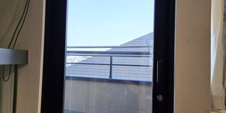 ブラウン系のミラーフィルムで、日中は外から室内が見えにくくなっています。