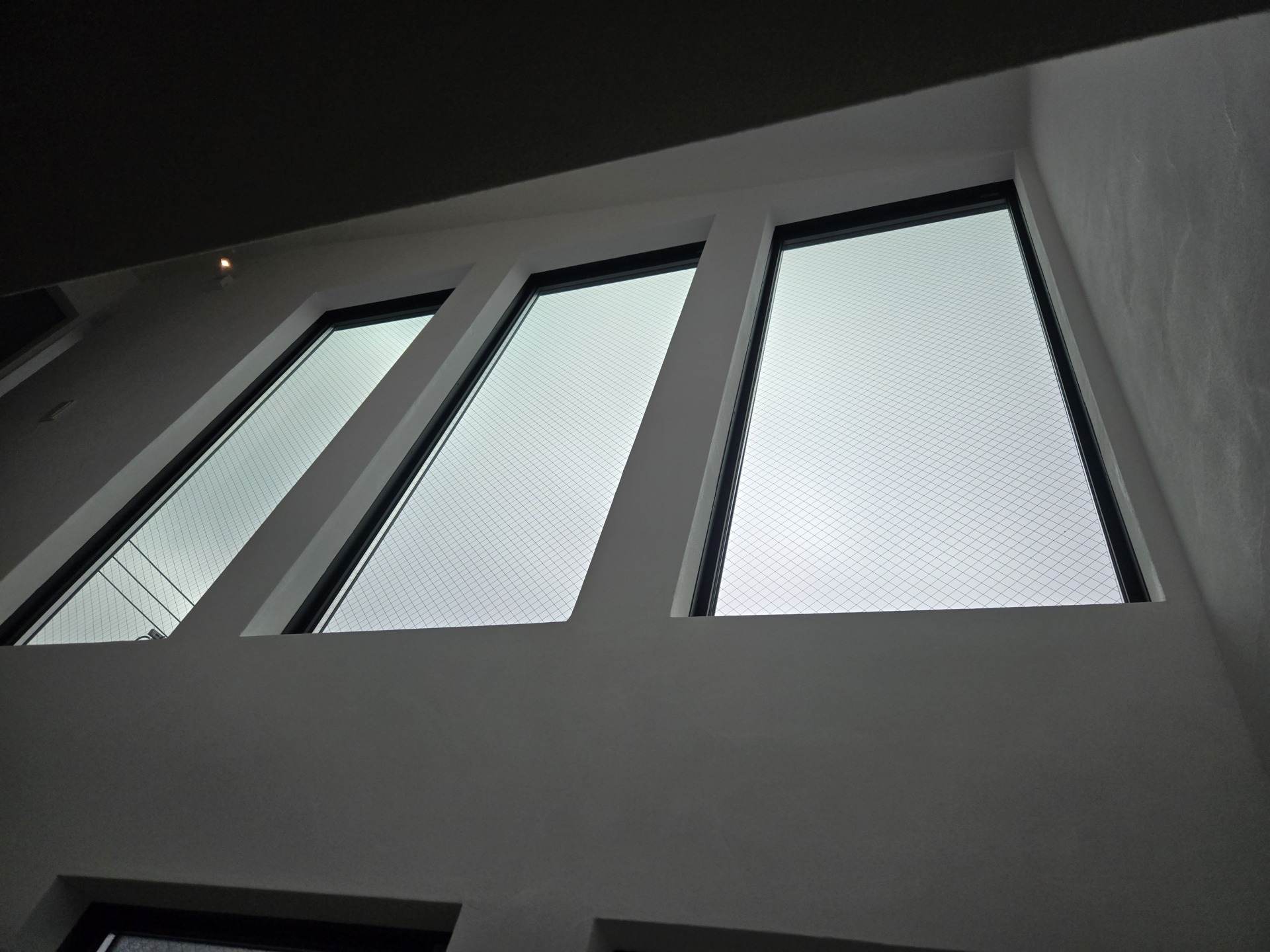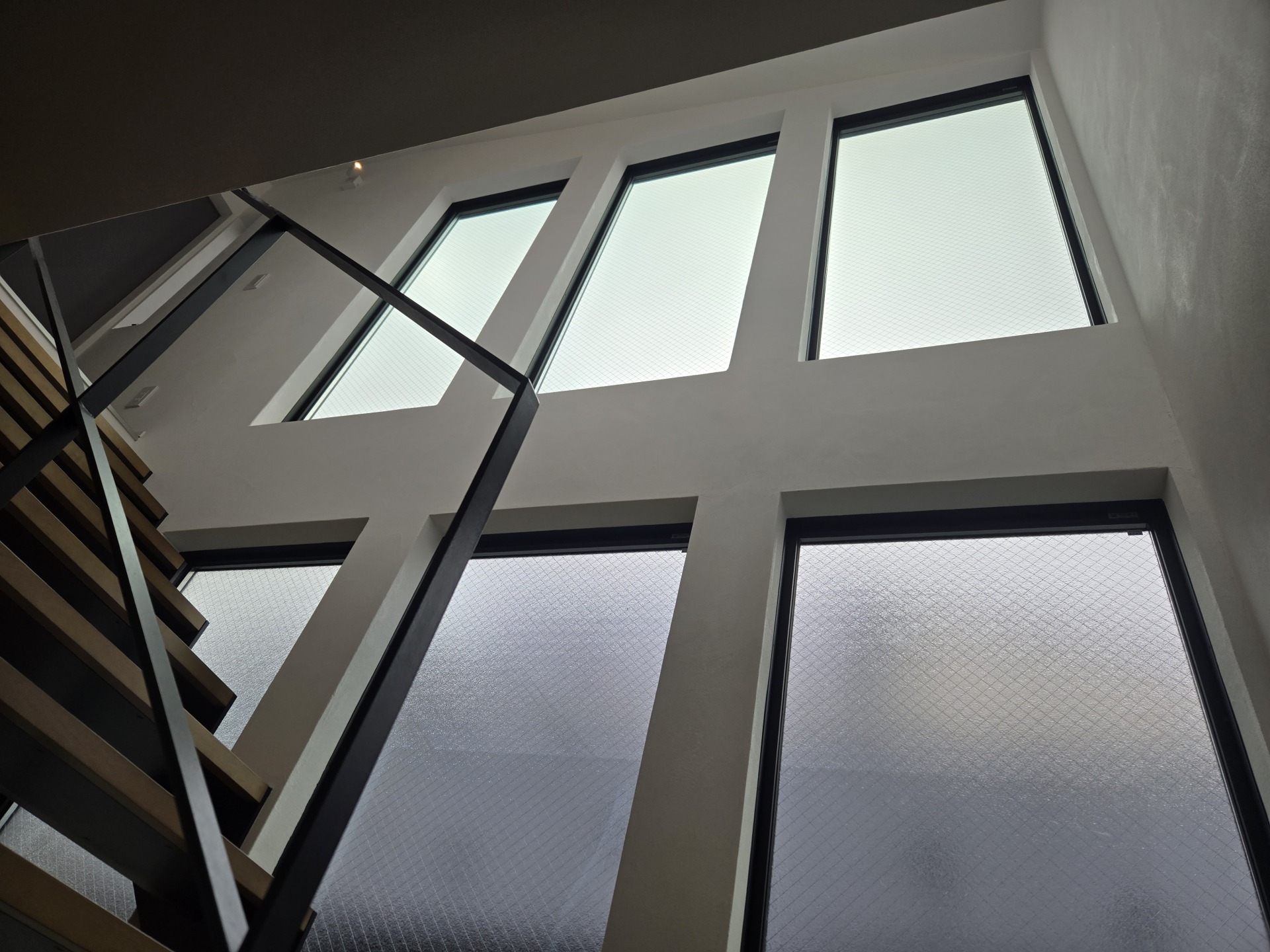 世田谷区の戸建ての階段上の窓ガラスの透明UVカット飛散防止フィルムを貼りました!